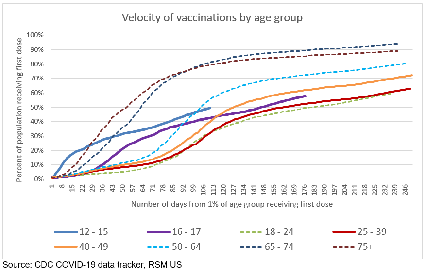 Le graphique suivant représente la vitesse de vaccination parmi différents groupes d’âge aux États-Unis, telle que mesurée par le pourcentage de la population ayant reçu au moins une dose.