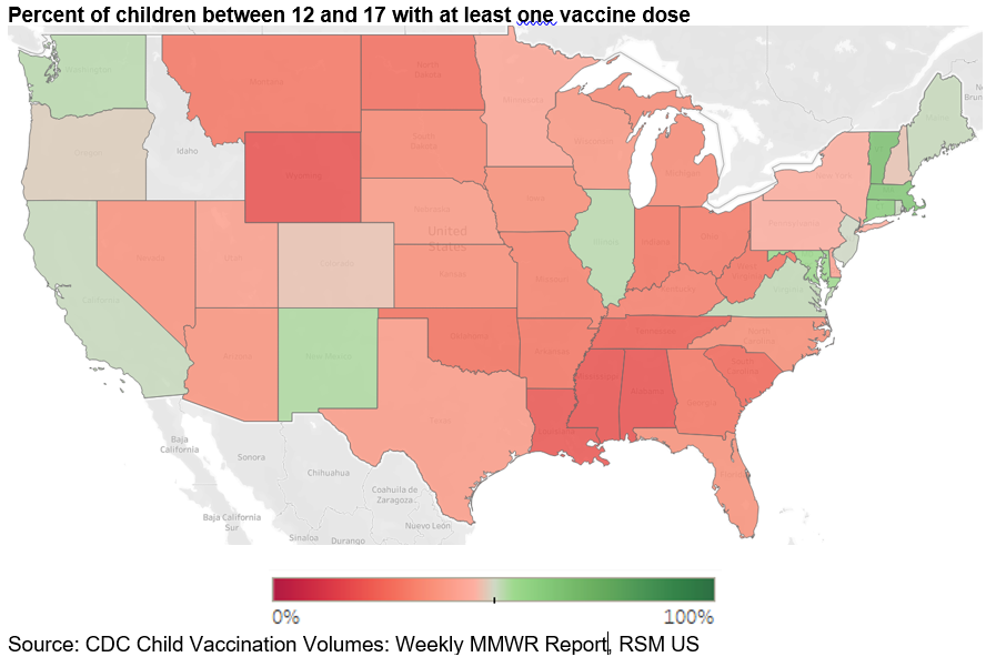 Ce sont des mesures importantes car il existe une corrélation inverse entre les taux de vaccination et les nouveaux cas. Ceci est encourageant pour les populations adultes fortement vaccinées, mais peu réconfortant pour les 22% des résidents américains (environ 75 millions) qui ont 17 ans ou moins et ont un accès limité ou inexistant aux vaccins, et qui n’ont aucun contrôle personnel pour prendre des décisions en matière de soins de santé .
