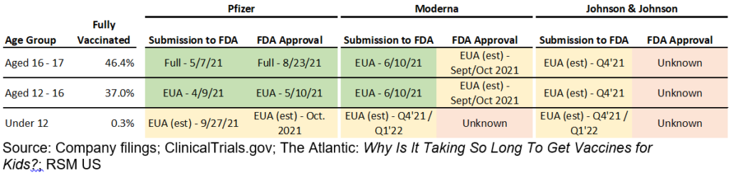 Les données les plus encourageantes suggèrent que les enfants de moins de 18 ans ont des taux d’adoption initiale rapides, même en considérant qu’il n’y a qu’un seul vaccin disponible. Ce comportement est probablement attribuable aux parents vaccinés qui se sont eux-mêmes utilisés comme un baromètre de sécurité pour la famille et qui se sentaient plus à l’aise pour faire vacciner leurs enfants.