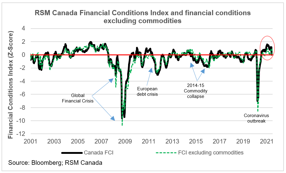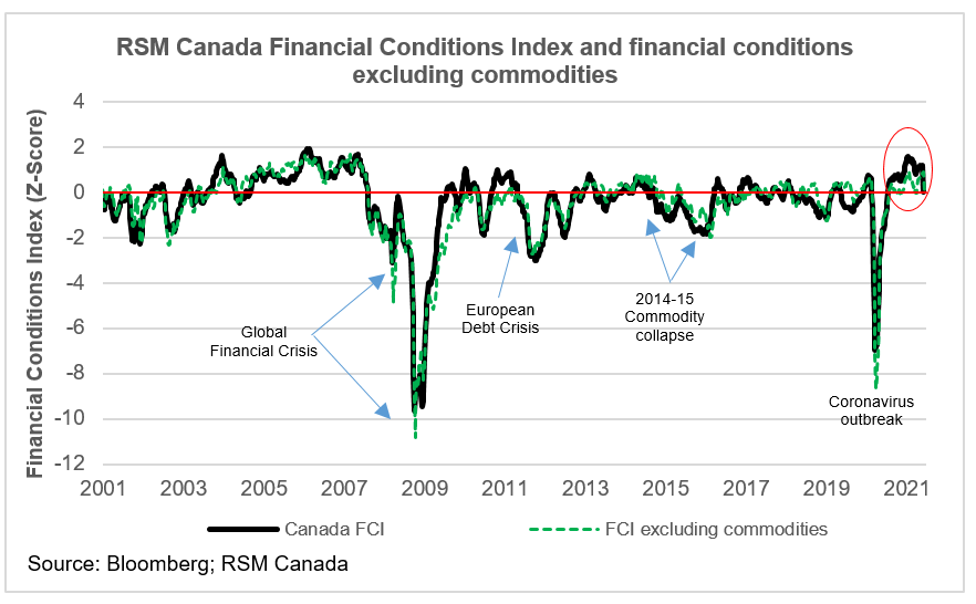 L’indice des conditions financières de RSM Canada continue d’indiquer des niveaux de risque réduits dans les prix des actifs négociés sur les marchés des matières premières, des actions, des obligations et de l’argent. Cela ouvre la voie à des investissements à long terme dans la nouvelle économie, conduisant à une productivité et une compétitivité accrues, ainsi qu’à des taux d’emploi et de dépenses plus élevés.