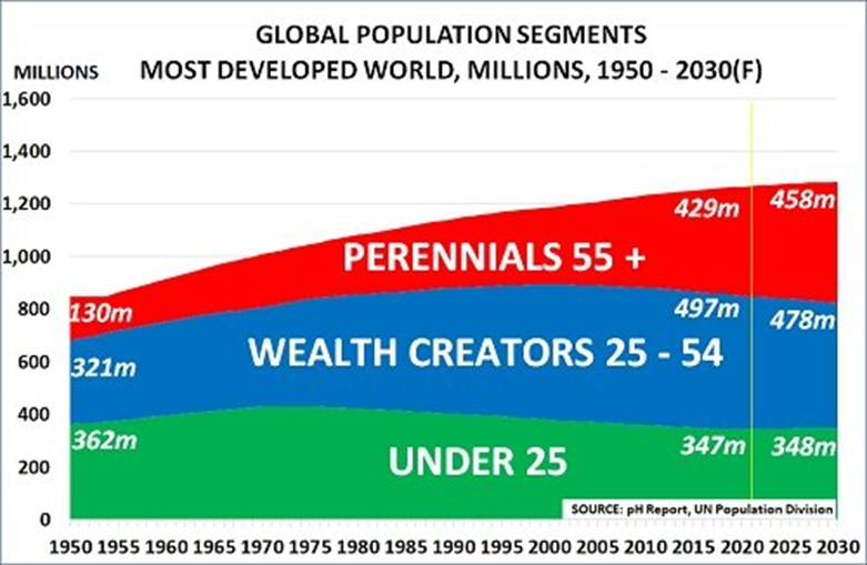 Mais comme le montre le graphique, la cohorte des plantes vivaces de 55 ans et plus est désormais la seule source de croissance démographique dans les économies riches « les plus développées » :