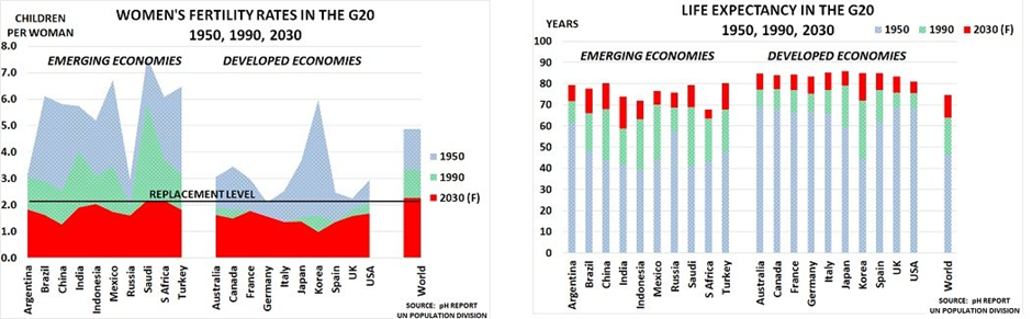 Comme le montrent les graphiques détaillés des taux de fécondité et de l’espérance de vie au sein du G20 depuis 1950 :