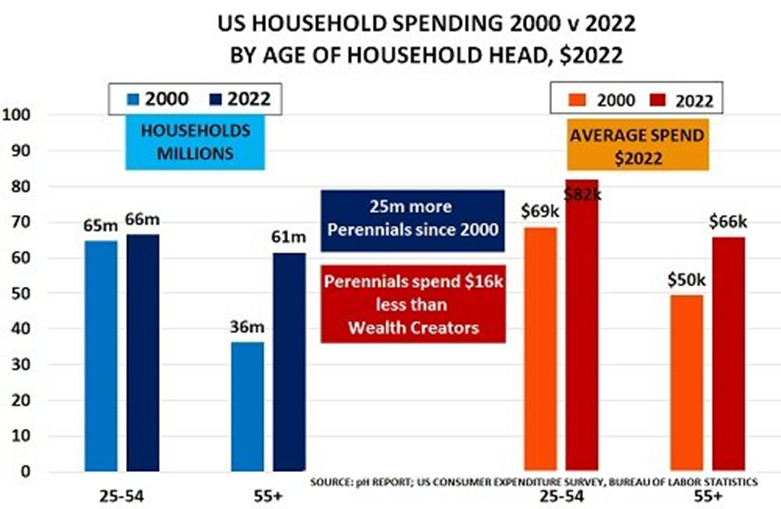 Et comme le confirment les habitudes de dépenses aux États-Unis, les plantes vivaces de 55 ans et plus sont essentiellement une économie de remplacement. Ils possèdent déjà la plupart de ce dont ils ont besoin et leurs revenus diminuent à mesure qu’ils prennent leur retraite.