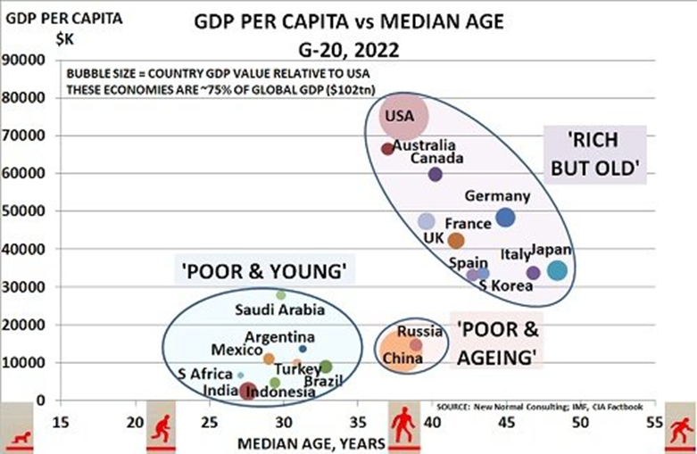 - Pauvre et vieillissant : Ce groupe ne contient que la Chine et la Russie. Son PIB par habitant est similaire à celui du groupe des « pauvres », mais l’âge médian se situe vers la fin de la trentaine.