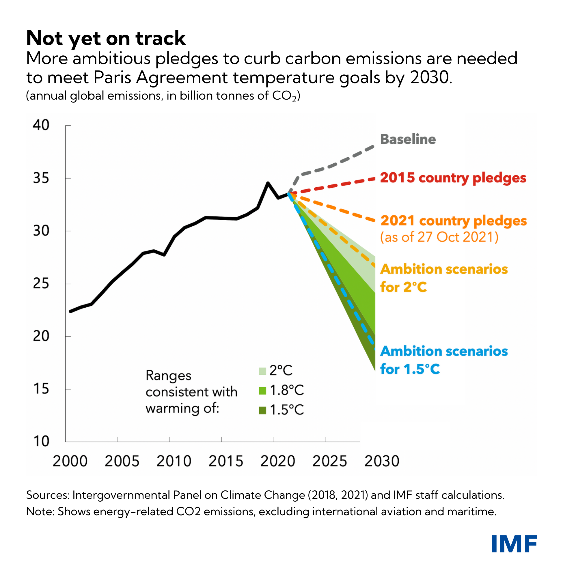 Alors que les dirigeants mondiaux se réunissent à Glasgow pour la COP26, une nouvelle note sur le climat du personnel du FMI montre que les politiques mondiales inchangées laisseront les émissions de carbone en 2030 bien plus élevées que nécessaire pour « maintenir 1,5 en vie ». Coupes de 55 pour cent en dessous des niveaux de référence en 2030 serait nécessaire de toute urgence pour atteindre cet objectif, et de 30 pour cent rencontrer le 2 degrés Celsius objectif.