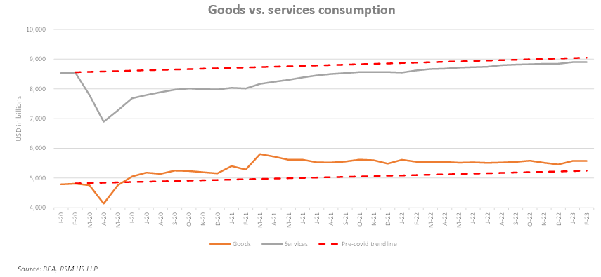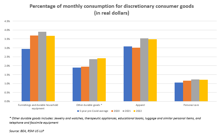 Le plus grand bénéficiaire des dépenses au cours des trois dernières années a été les entreprises de produits de consommation. Au cours des cinq années précédant la pandémie, les dépenses mensuelles en services comme les restaurants, les voyages et les réparations domiciliaires représentaient en moyenne 65 % de la consommation mensuelle totale. Mais depuis mars 2020, ce pourcentage est tombé à 61 %, le solde se déplaçant vers les biens.