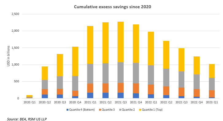 L’excès d’épargne a été un vent arrière important pour les consommateurs depuis le début de la pandémie. Même avec environ 1 billion de dollars d’épargne excédentaire restante, cela ne devrait pas avoir le même impact sur la consommation qu’en 2021, car près de 75 % de l’épargne excédentaire est concentrée parmi les deux quartiles supérieurs des revenus.