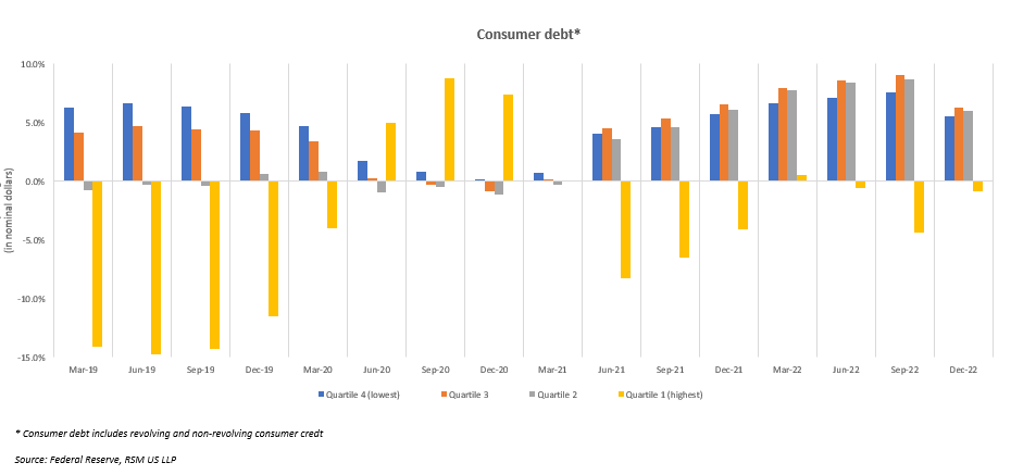Les consommateurs ne sont pas connus pour arrêter de dépenser quand ils le devraient, mais plutôt quand ils le doivent. Pour certains niveaux de revenu, ce jour est probablement déjà passé. Selon la Réserve fédérale, les niveaux d’endettement des consommateurs ont augmenté d’une année sur l’autre pour tous les quartiles de revenu en décembre 2022, à l’exception du quartile supérieur. De plus, la dette de consommation totale attribuée aux deux quartiles inférieurs a atteint près de 92 %, la plus forte concentration de dette de consommation de cette cohorte en 10 ans. Une grande partie de cette dette, cependant, est attribuée aux prêts étudiants, et elle exclut également l’impact d’acheter maintenant, payer plus tard, qui s’est développé pour inclure les produits de tous les jours, ce qui suggère qu’une partie de la dette est plus importante qu’il n’y paraît.
