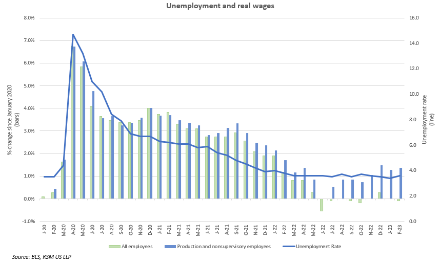 Enfin, le travail continue d’être un point positif pour les consommateurs. Avec un taux de chômage de 3,6% au dernier relevé, les emplois ouverts ne manquent pas. Tant que les consommateurs auront un salaire constant, certaines dépenses discrétionnaires se poursuivront très probablement. En outre, alors que les niveaux d’épargne excédentaires ont diminué pour les salariés à faible revenu, comme indiqué ci-dessus, les salaires réels des employés de la production et des non-superviseurs ont augmenté de 1,4 % en février 2023, fournissant un soutien financier essentiel.