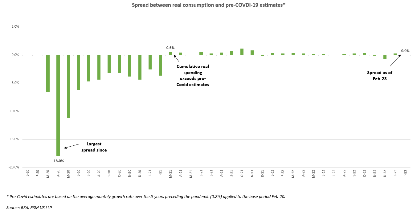 Après le choc initial de la pandémie en mars et avril 2020, l’écart entre la consommation réelle cumulée (corrigée de l’inflation) et les estimations pré-COVID-19 a atteint un creux de 18,0 %, le taux de chômage ayant atteint un niveau record, 14,7 %, en avril 2020. Aidées par les paiements de relance économique, les dépenses réelles ont dépassé les estimations pré-COVID-19 en mars 2021 et se sont poursuivies jusqu’en décembre, lorsqu’une résurgence du coronavirus a réduit les dépenses. Mais même avec ce recul, les dépenses réelles ont augmenté de 8,3 % sur l’année, après une baisse de 3,0 % en 2020. L’année dernière, la consommation globale a continué de croître, augmentant de 2,8 % sur l’année.
