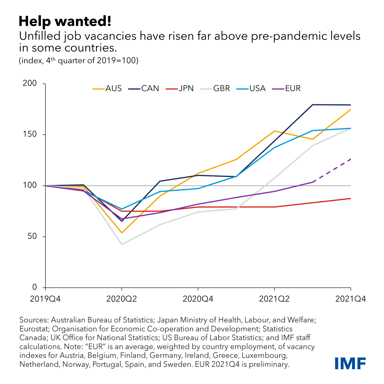 À la fin de 2021, il y avait 50 à 80 % d’emplois non pourvus en plus en Australie, au Canada, au Royaume-Uni et aux États-Unis qu’avant la pandémie. Les postes vacants étaient également égaux ou supérieurs à leurs niveaux de 2019 dans d’autres économies avancées et ont augmenté régulièrement dans tous les secteurs, y compris ceux qui nécessitent davantage de contacts, tels que l’hôtellerie et les transports. Les augmentations des postes vacants ont été les plus importantes pour les emplois peu qualifiés.
