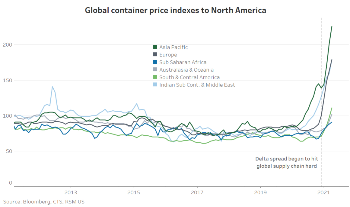Les régions qui partagent des volumes de conteneurs entrants plus petits vers l’Amérique du Nord comme l’Australasie et l’Océanie, l’Amérique latine et l’Afrique subsaharienne ont également connu des hausses significatives des niveaux de prix, augmentant respectivement de 29 %, 56 % et 21 %.