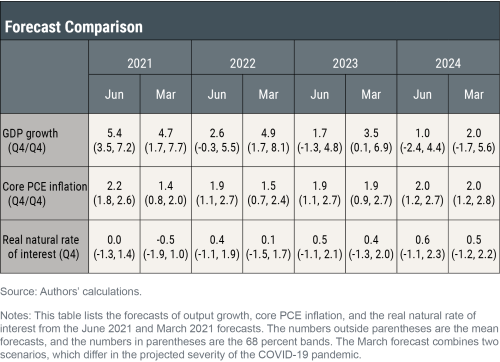 Les prévisions du modèle de juin 2021 sont présentées dans le tableau ci-dessous, à côté de celles de mars, et illustrées dans les graphiques suivants. Les prévisions sont basées sur des données macroéconomiques trimestrielles publiées jusqu’en 2021 : T1, augmentées pour 2021 : T2 avec les prévisions médianes de croissance du PIB réel et d’inflation de base du PCE à partir de la publication du SPF de mai, ainsi que les rendements des titres du Trésor à 10 ans et » Baa » obligations d’entreprise sur la base des moyennes 2021:T2 jusqu’au 1er juin.