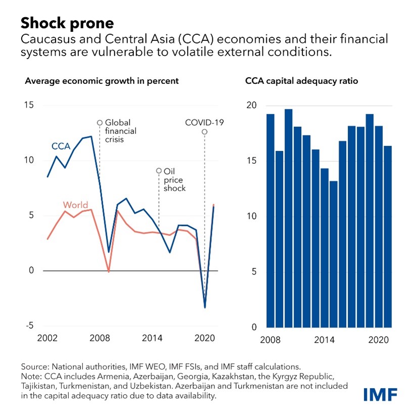 Fortement tributaires des exportations de produits de base, des envois de fonds et du tourisme, les économies du Caucase et d’Asie centrale et leurs systèmes financiers sont vulnérables aux chocs externes volatils.