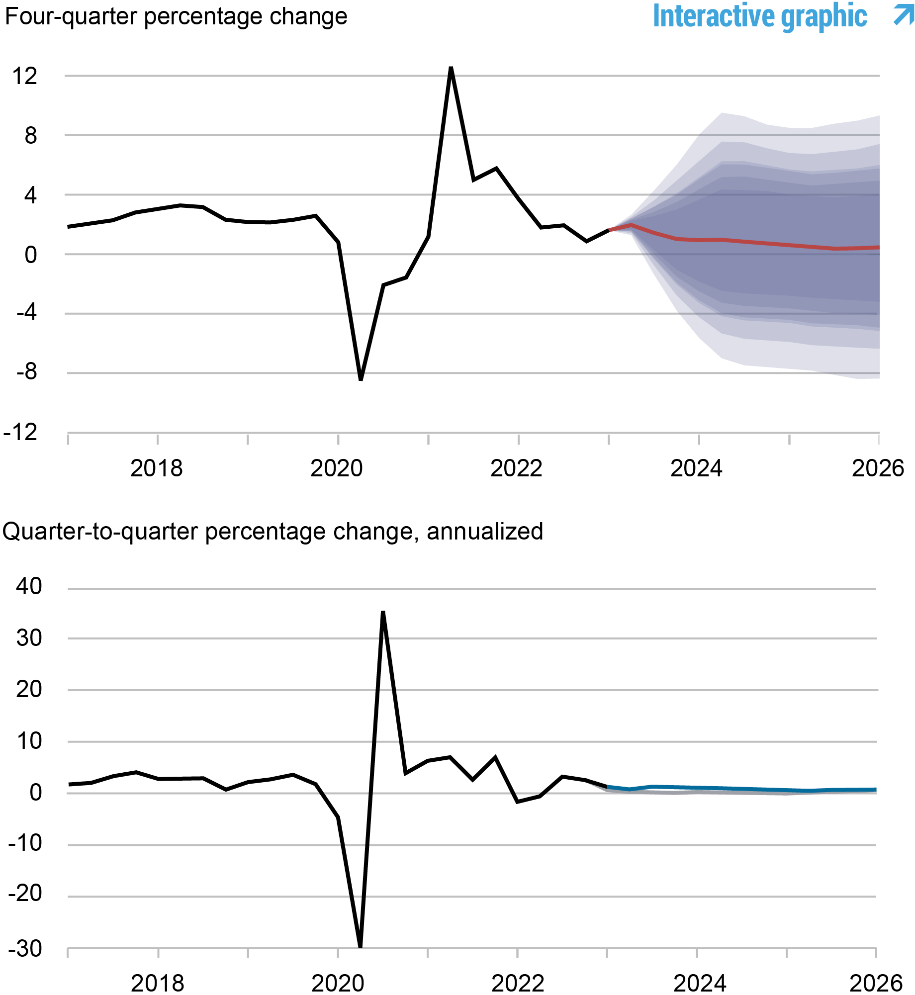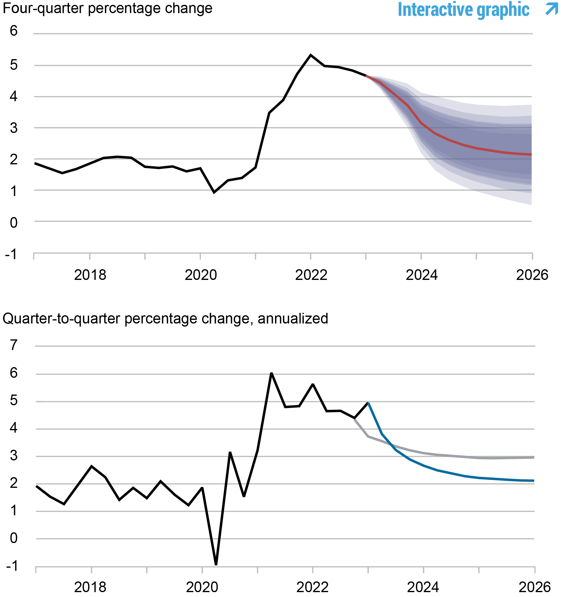Notes : Ces deux panneaux illustrent l’inflation sous-jacente des dépenses de consommation personnelle (PCE). Dans le panneau supérieur, la ligne noire indique les données réelles et la ligne rouge indique les prévisions du modèle. Les zones ombrées marquent l’incertitude associée à nos prévisions à des intervalles de probabilité de 50, 60, 70, 80 et 90 %. Dans le panneau inférieur, la ligne bleue indique les prévisions actuelles (d’un trimestre à l’autre, annualisées) et la ligne grise indique les prévisions de mars 2023.