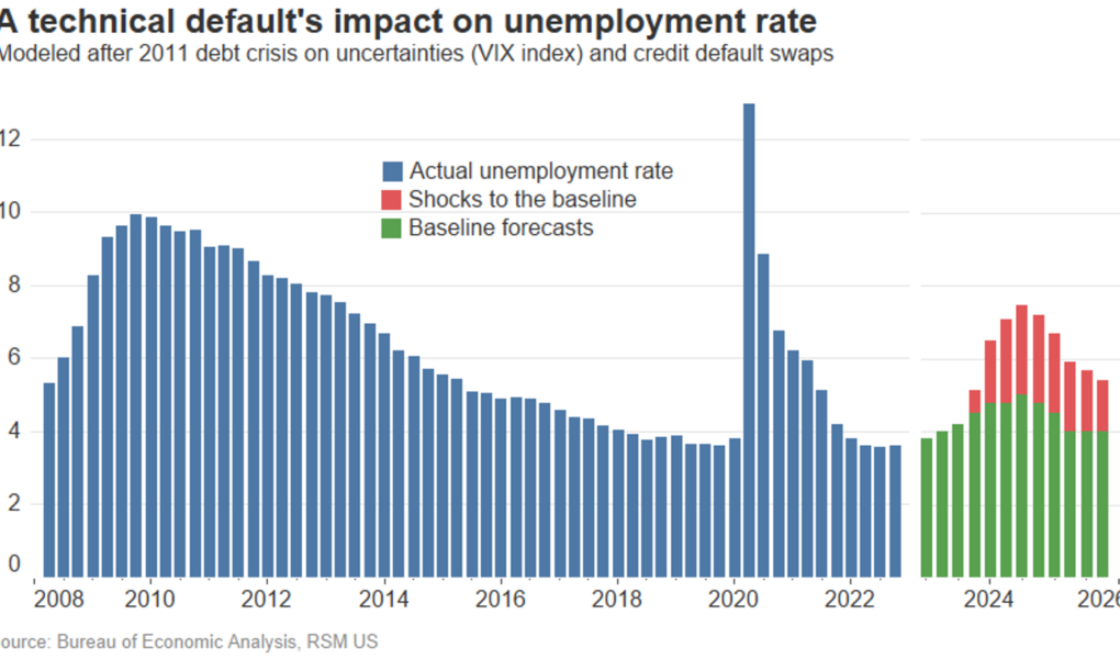 Le premier scénario est un défaut technique, défini comme une période prolongée de non-paiement de certaines ou de toutes les responsabilités financières des États-Unis. Sur la base de notre modèle de choc, un défaut technique doublerait le taux de chômage actuel de 3,4 % à près de 7 %, ferait basculer l’économie dans la récession dans les six mois et, après une courte période de désinflation, entraînerait une poussée d’inflation plus persistante accompagnée de une détérioration de la situation budgétaire de l’économie.