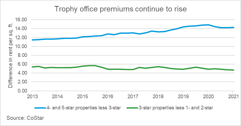À l’instar des tendances nationales, les nouveaux bâtiments trophées continuent d’intéresser les locataires pour remplacer les espaces plus anciens. Le loyer de ces propriétés haut de gamme est bien supérieur à celui de leurs pairs 3 étoiles. Les loyers premium des bureaux 4 et 5 étoiles par rapport aux bureaux 3 étoiles ont augmenté de près de 25 % depuis 2013, selon les données de CoStar. En comparaison, la différence de loyer du marché entre les espaces de bureaux 3 étoiles et 1 et 2 étoiles s’est réduite au cours de cette période. Les propriétaires d’immeubles de moindre qualité devront trouver des opportunités de réaménagement ou risquer de perdre des locataires.